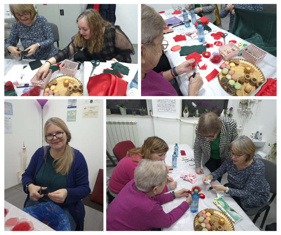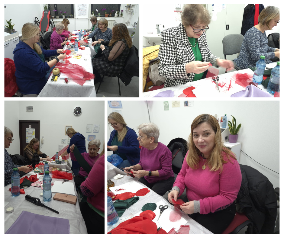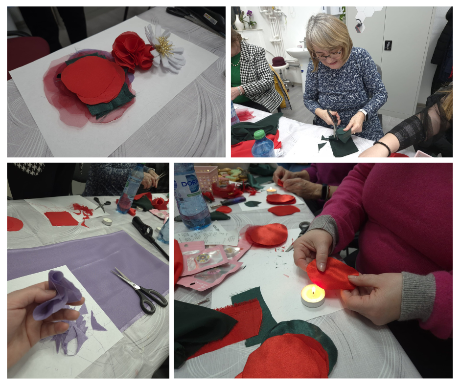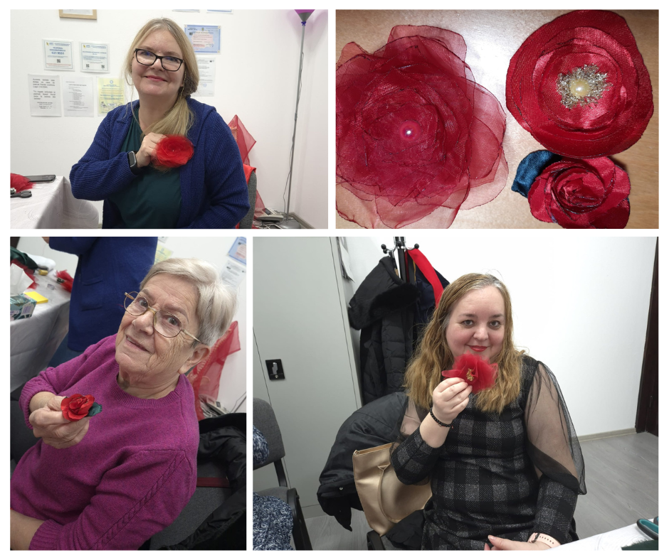 Atelierul a avut loc în cabinet, într-un cadru intim și prietenos, unde participantele au lucrat cu materiale textile, organza, fetru și accesorii decorative pentru a da formă propriilor flori simbolice.